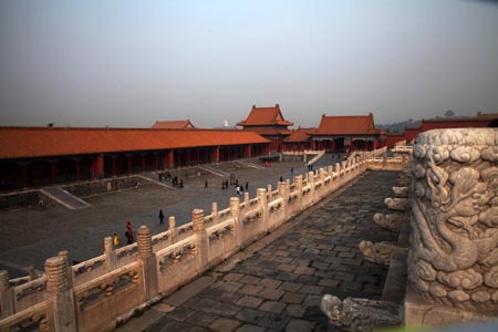 Nachdem wir versucht hatten in der Nacht den Jetlag Best möglichst zu verarbeiten ging des am zweiten Tag schon um 7:30 Uhr nach dem Frühstück (mit teilweise seltsamen Zutaten) los. Auf dem Programm stand die verbotene Stadt Tiananmen Platz, Nationalmuseum und ein Besuch in einem Nostalgie- und Kuriositätenmarkt (Internettip). Los ging es mit der Verbotenen Stadt. Nach 45 min Fußmarsch standen wir am Nordtor der verbotenen Stadt, Einlass war nur am Südtor!!! Da dies nochmal 2 km Fußmarsch bedeuteten ließen wir uns zu einer Rigschafahrt hinreißen. Das war ein Fehler! Natürlich hatten wir eine Festpreis vereinbart und uns mehrfach rückversichert. Es nützte nichts. Wir wurden in ein kleine Gasse gelenkt mit dem Hinweis der Südeingang befände sich nur wenige Meter um die Ecke. Nun forderten die beiden Fahrer statt der vereinbarten 3 Yuan 300, je Person !!!! Das führte natürlich zu Diskussionen die ich hier nicht im Einzelnen wiedergeben möchte. Unter Hinweis auf die Polizei haben wir uns dann auf 50 Yuan /Person (6 Euro) geeinigt. Wir bezahlten mit einem 100erter. Kaum haben wir uns abgewendet reklamierte einer der Fahrer den Schein. Er wollte Ihn nicht annehmen, da eingerissen. Jens tauschte den Schein gegen einen anderen. Dieses unangenehme Ereignis hinter uns lassend, ging es nun in die verbotene Stadt. Am Ticketschalter wollte Jens unsere Tickets hohlen und mit einem 100er bezahlen. Man ahnt es, der Fahrer hat unseren guten Schein gegen eine Fälschung eingetauscht. Und das passiert uns Banknotensammler !!!!! Naja der Schaden hielt sich Grenzen (ca. 12 Euro) und man hat eine Erinnerung im Album. Diese Geschichte vergisst man nicht mehr so schnell. Die Verbotene Stadt selber zeichnet sich zum ersten durch Ihre außerordentliche Größe aus, zum andern durch den Prunk der zahlreichen Tempel und Subpaläste. Verwinkelt mit zahlreichen kleineren Palästen der Eunuchen, Prinzen Kaiserin und Konkubinen ergibt sich ein beeindruckender Gebäudekomplex.