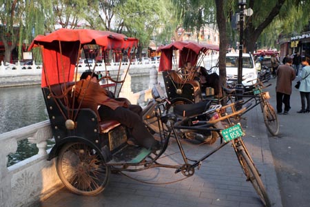 Ein Blick in die Straße in der unser Hotel liegen sollte ließ uns etwas zweifeln ob es eine gute Wahl war hier zu übernachten. Es sah schon ein wenig heruntergekommen aus. Nach Erreichen des Hotels waren wir dann aber angenehm überrascht. Ein sehr schönes gepflegtes Haus mit überaus zuvorkommendem Personal. Nach dem Einchecken im Hotel, das in einem alten Stadtteil mit kleinen Häusern in noch kleineren Gassen liegt, machten wir eine lange Fuß-Tour am Houhai (Der See wurde für den Kaiser von China extra angelegt) entlang, die Fische die daraus geholt werden würden wir beide nicht essen wollen. (wäre bei uns wohl Sondermüll!). Zum Abendessen gab es in einem sehr guten Restaurant Pilzsuppe und danach geröstete, pikante Pekingente. Nach mehreren Tsingtau Bier und einem delikaten australischen Rotwein hatten wir gegen 20 Uhr Ortszeit genügend Bettschwere um den ersten Tag in China abschließen zu können.