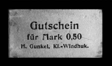 1/2 Mark Militärgeld der 3. Kompagnie, stationiert in Kanus und Keetmanshoop. Diese bereits zu Friedenszeiten ausgegebene Stück liefen auch in der Kriegszeit als allgemein anerkannter Kleingeldersatz um.