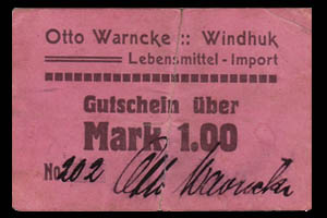 Nach der völligen Besetzung der Kolonie durch die Südafrikanisch Union 1915, führte man die englische Währung ein. Die bis dato umlaufenden Reichsmarkscheine sowie auch die Seitz-Noten wurden für ungültig erklärt. Durch die völlig unvorbereitete Währungsumstellung fehlte es jedoch an allen Ecken und Enden an Klein- und Wechselgeld. Abhilfe versprach man sich dadurch, dass man großen Firmen die Möglichkeit einräumte, Notgeld zu 10, 25, 0 Pf, 1 Mark, 2 Mark und 3 Mark auszugeben. Bald darauf gaben aber auch kleine und kleinste Geschäfte Papiernotgeld aus. Selbst Wertmarken und Kasino-Zahlmarken liefen als Währung um.