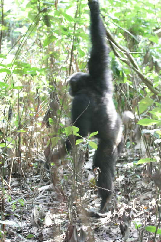 Nach der vorhergesagten Marschzeit trafen wir dann auch wieder auf die Schimpansenfamilie. Völlig unerwartet begegneten wir den ersten Tieren auf einem Fußweg. Im Gegensatz zum vorigen Tag als uns die Tiere völlig ignorierten, zeigte ein Männchen an diesem Tag ein Imponiergehabe und schlug mit einem Ast auf ein Gebüsch. Für diesen Fall wurden wir vom Ranger instruiert uns bewegungslos zu verhalten und keinesfalls wegzulaufen. Dieses Verhalten bewährte sich, nach einigen Scheinangriffen zog sich das Männchen zurück. Ein wenig eingeschüchtert folgten wir den Tieren in sicherem Abstand. Die Situation entspannte sich alsbald und wir konnten wieder bis auf wenige Meter an die Tiere heran. Bei dieser Tour trafen wir auch zwei der japanischen Forscher. Diese studieren das Sozialverhalten der Tiere bereits seit 20 Jahren im Park. Sie hatten Ihre Station mittlerweile weiter oberhalb in den Bergen aufgeschlagen. Wiederum nach ca. einer Stunde mussten wir den Rückweg antreten. Entgegen meiner Befürchtung wurden wir in keiner Weise von Moskitos oder Tse Tses angegriffen, anders als am Strand schienen die Tiere im Wald nicht zu leben, das machte den Aufenthalt dann doch erträglich. Zurück im Camp waren unsere letzten mitgebrachten Wasserreserven aufgebraucht, nun gab es nur noch abgekochtes Seewasser mit „Schwebstoffen“. Für den Abend am Lagerfeuer hatten wir noch je Person 1 Flasche (Warmes) Bier aufgehoben.